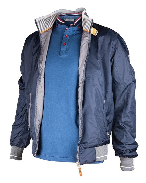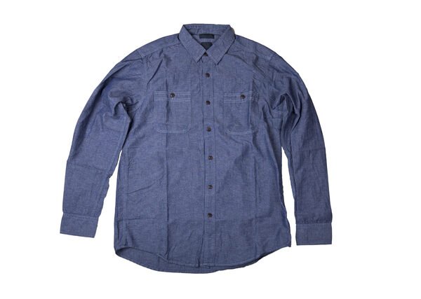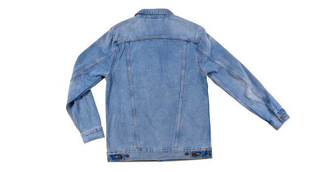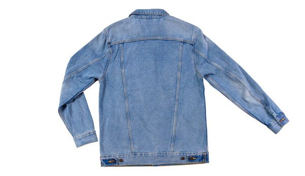 Back view – blue jeans jacket isolated on white background, denim jacket close up,